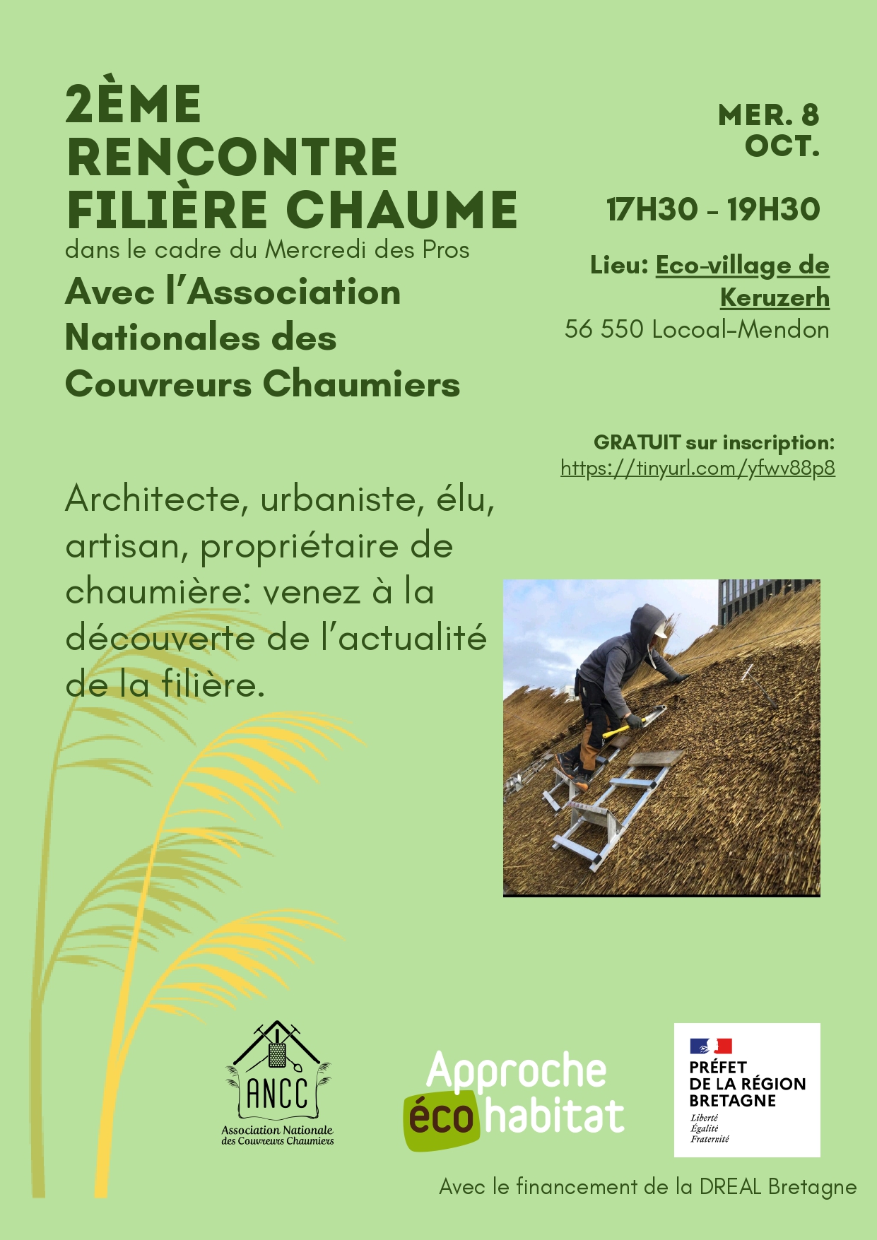 L’Association Nationale des Couvreurs Chaumiers, avec le soutien de la DREAL Bretagne et en partenariat avec APPROCHE-Ecohabitat, invite les architectes, les urbanistes, les élu.e.s, les artisan.e.s, ou les propriétaires de chaumière, à venir à la 2ème rencontre de la filière chaume, le mercredi 8 octobre 2025 de 17h30 à 19h30.
