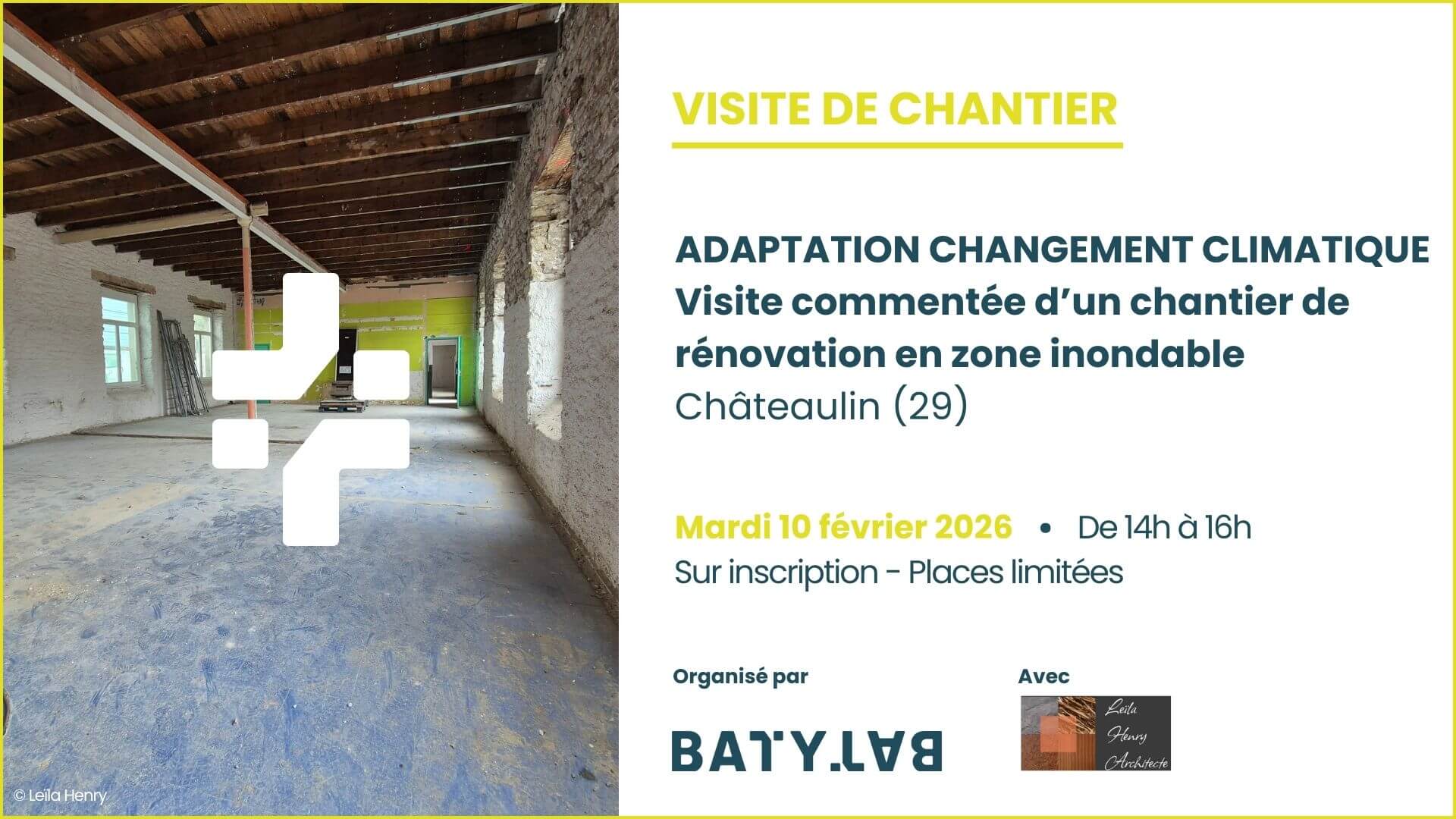 Dans le cadre de son Groupe de Travail dédié à l’Adaptation au Changement Climatique, Batylab organise auprès de ses membres adhérents, une visite de chantier commentée d’une rénovation en zone inondable à Châteaulin, dans le Finistère.