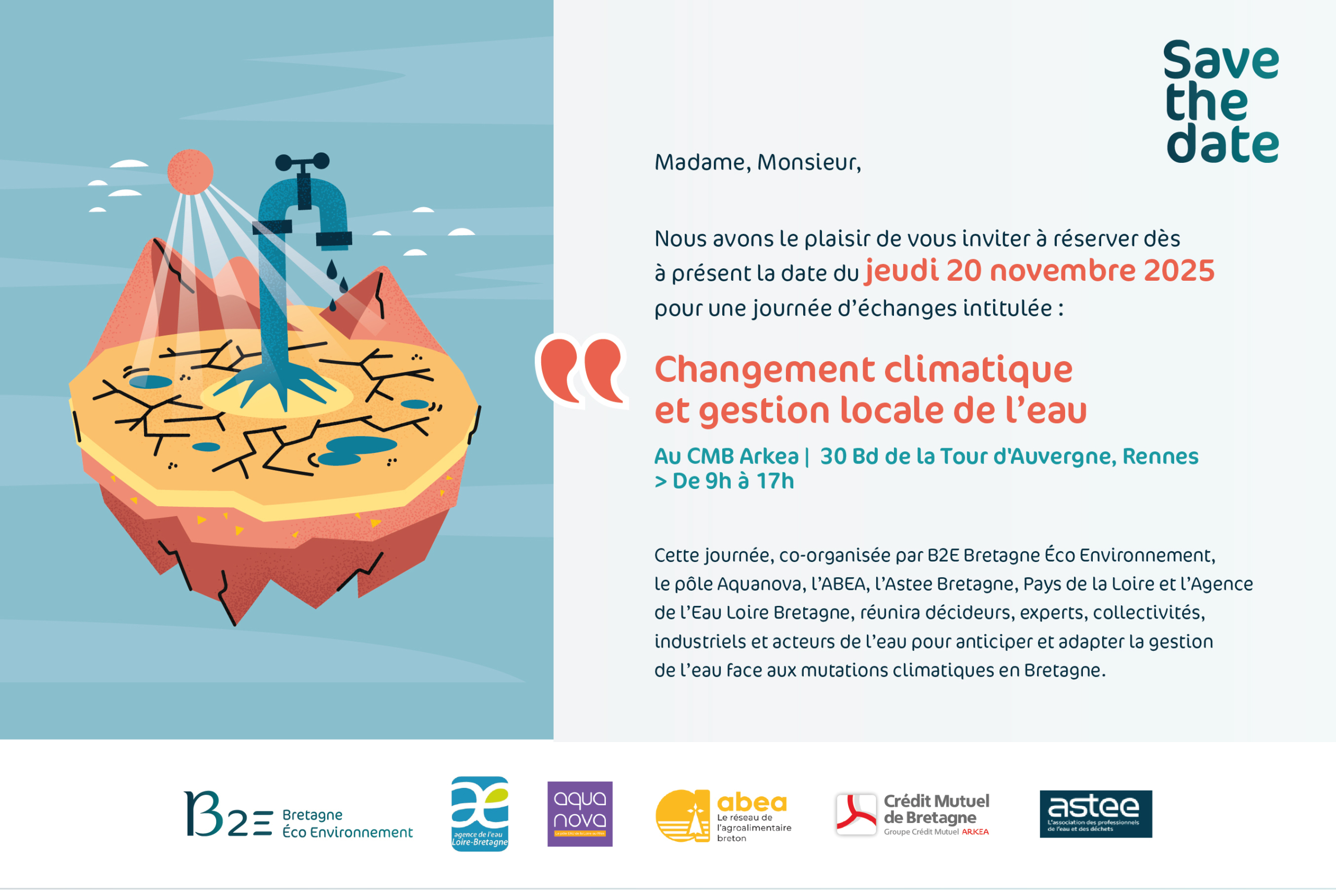 B2E Bretagne Éco Environnement, le pôle Aquanova, l’ABEA, l’Astee Bretagne, Pays de la Loire et l’Agence de l’Eau Loire Bretagne, organise le jeudi 20 novembre 2025 une journée d’échanges intitulée « Changement climatique et gestion locale de l’eau ». Cet événement rassemblera décideurs, experts, collectivités, industriels et acteurs de l’eau afin d’anticiper les enjeux et d’adapter la gestion de la ressource face aux mutations climatiques en Bretagne.