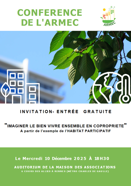 L’armec vous donne rendez-vous le mercredi 10 décembre 2025 à partir de 18h30 pour une conférence sur « imaginer le bien vivre ensemble en copropriété », illustrée par l’exemple de l’Habitat Participatif.