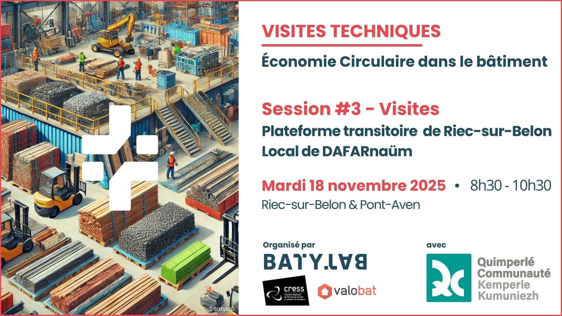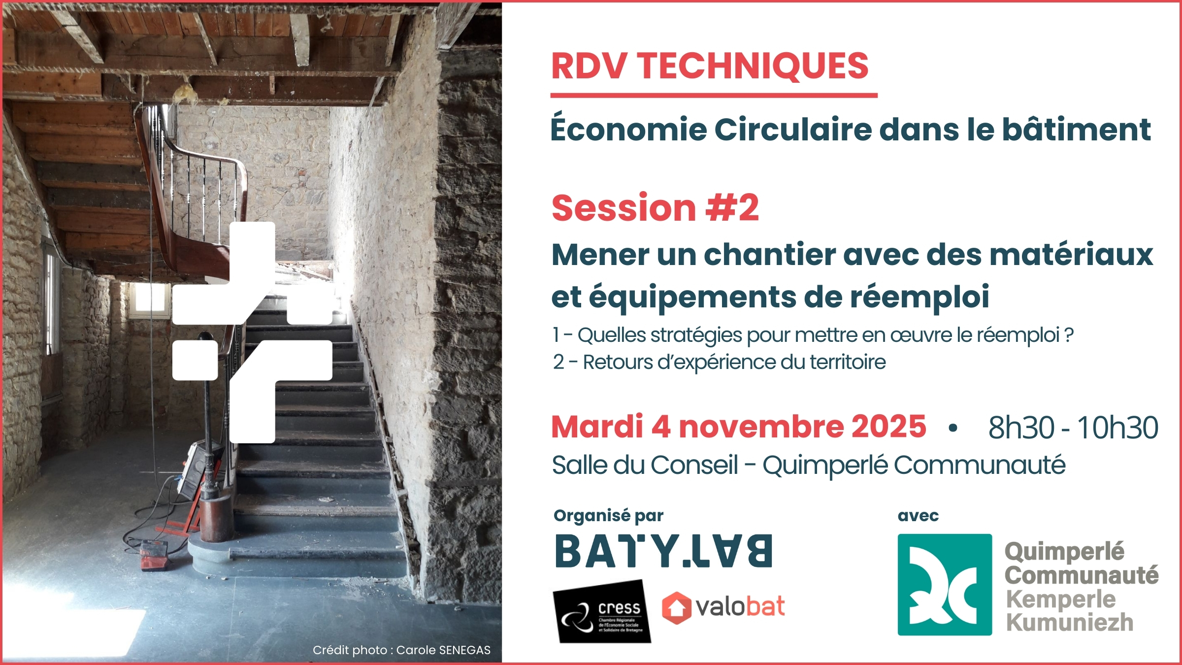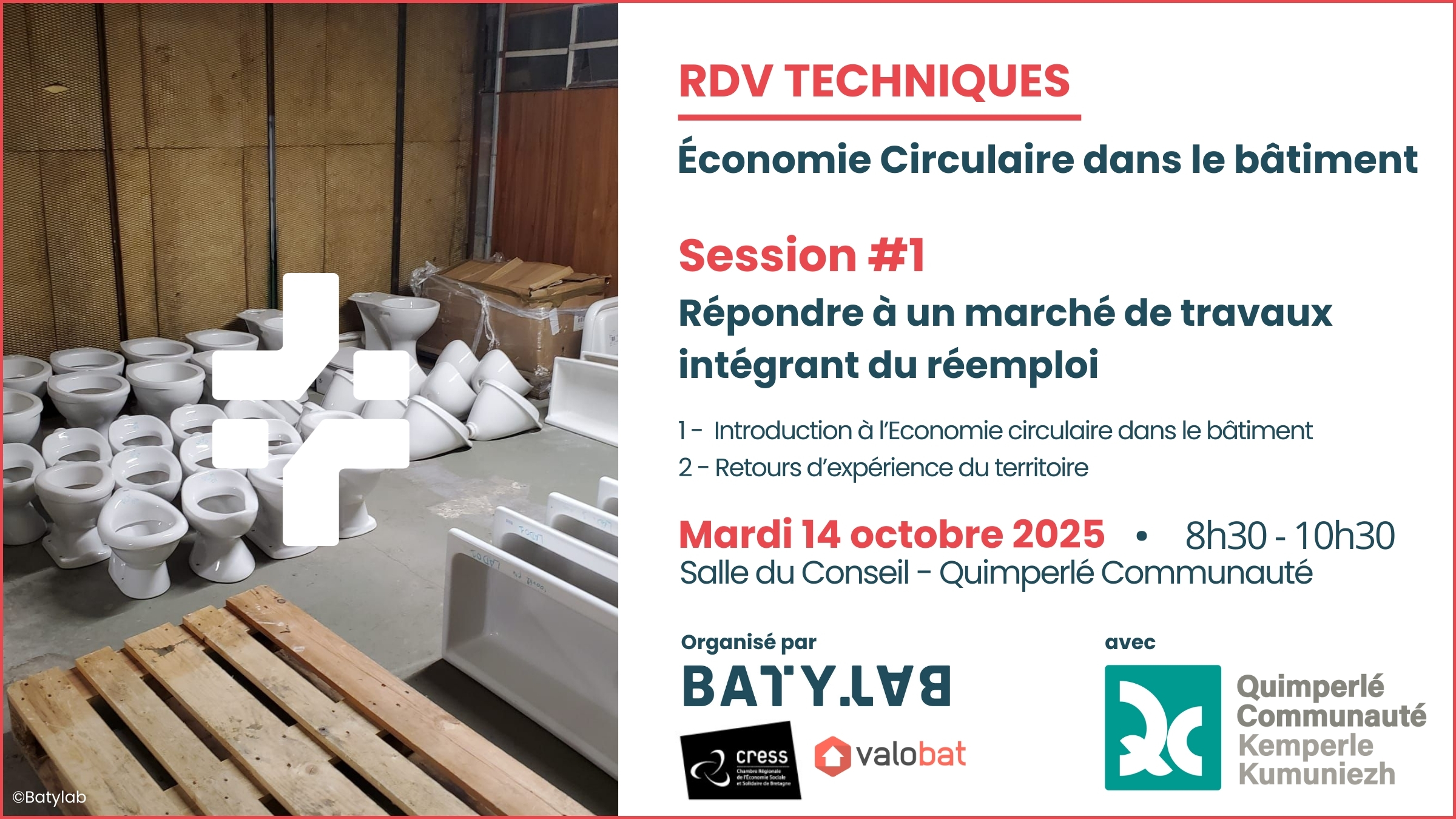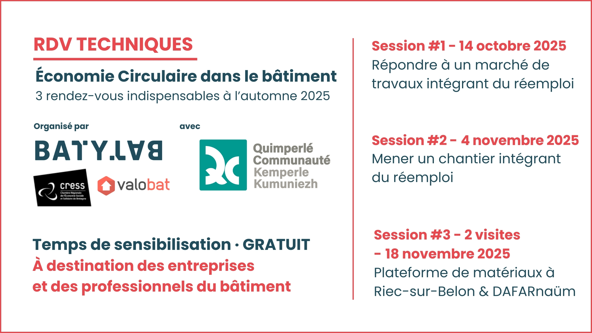 Dans le cadre de l’Appel à Manifestation d’Intérêt de Valobat, la Chambre régionale de l’économie sociale et solidaire (Cress) Bretagne et Batylab organisent à l’automne, avec Quimperlé Communauté, trois temps de sensibilisation à l’économie circulaire dans le bâtiment, à destination des entreprises et professionnels du bâtiment.
