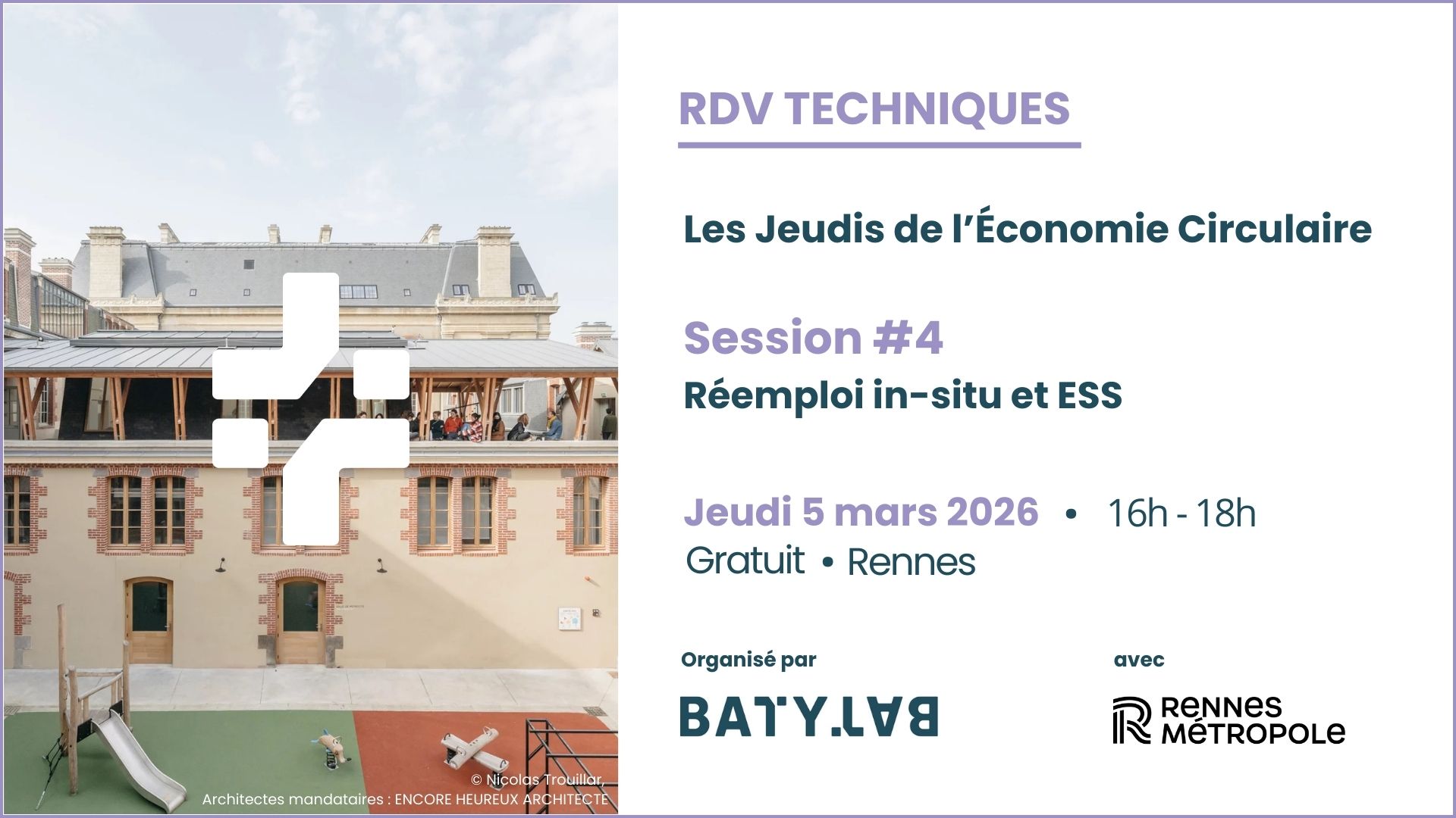 La quatrième session aura lieu à sur Rennes Métropole le 5 mars 2026 avec pour thématique : réemploi in-situ et ESS.