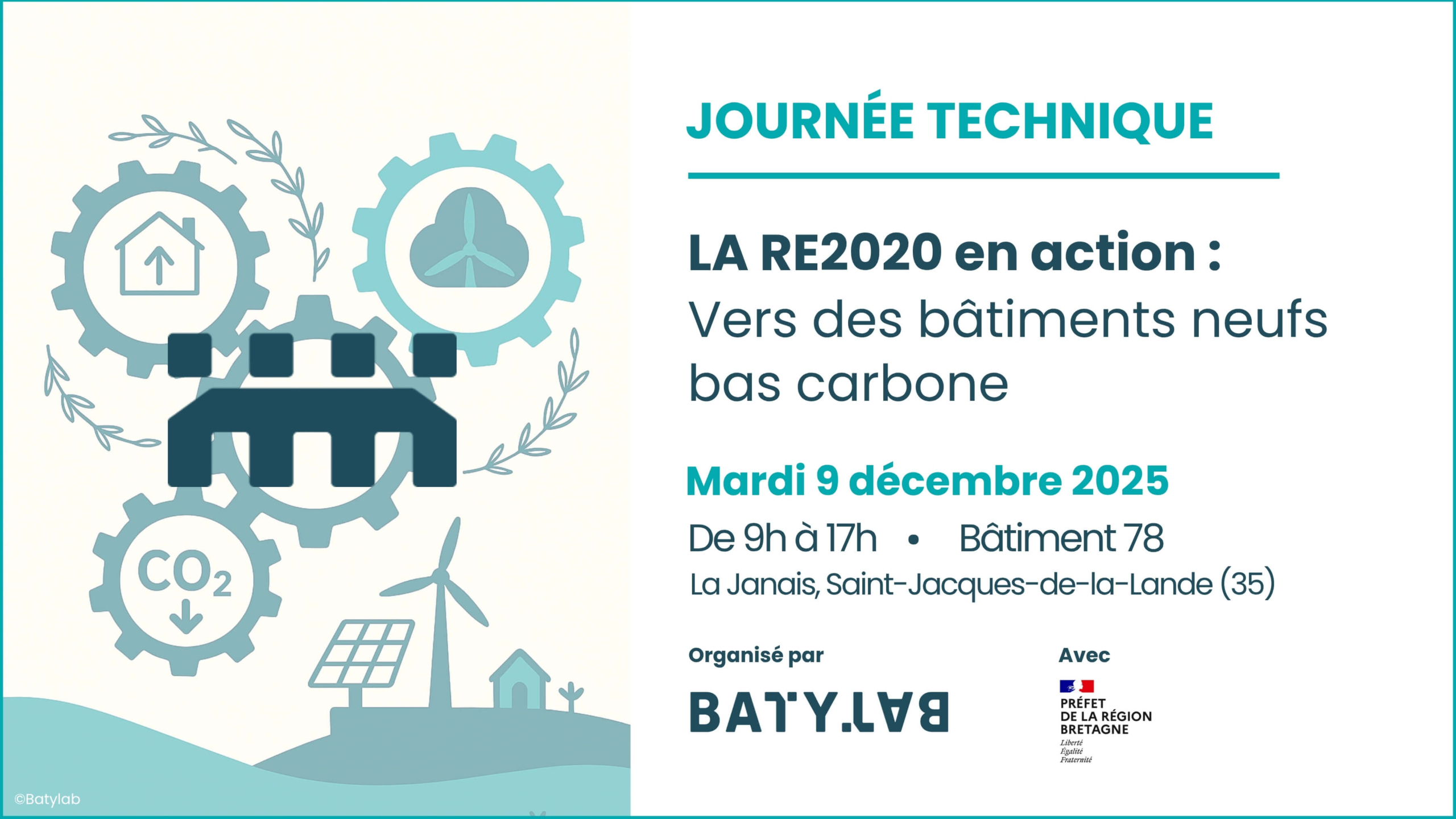 Pour approfondir ce sujet, Batylab s’associe à la DREAL Bretagne pour vous proposer une journée technique ouverte à l’ensemble des professionnels de la filière, avec pour thématique : « la RE2020 en action : vers des bâtiments neufs bas carbone« .